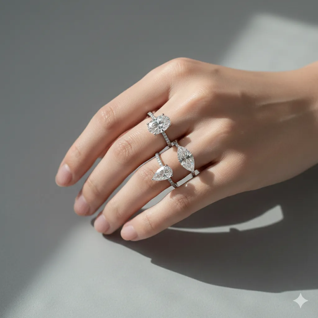 Quy tắc là "không chọn bản nhẫn quá dày". Khi chọn viên chủ nhẫn cưới, hãy ưu tiên giác cắt Tròn (Round Brilliant) hoặc Princess (Vuông). Bản nhẫn mỏng khoảng 1.8mm sẽ giúp tạo khoảng trống da thịt, khiến ngón tay trông dài hơn thực tế.