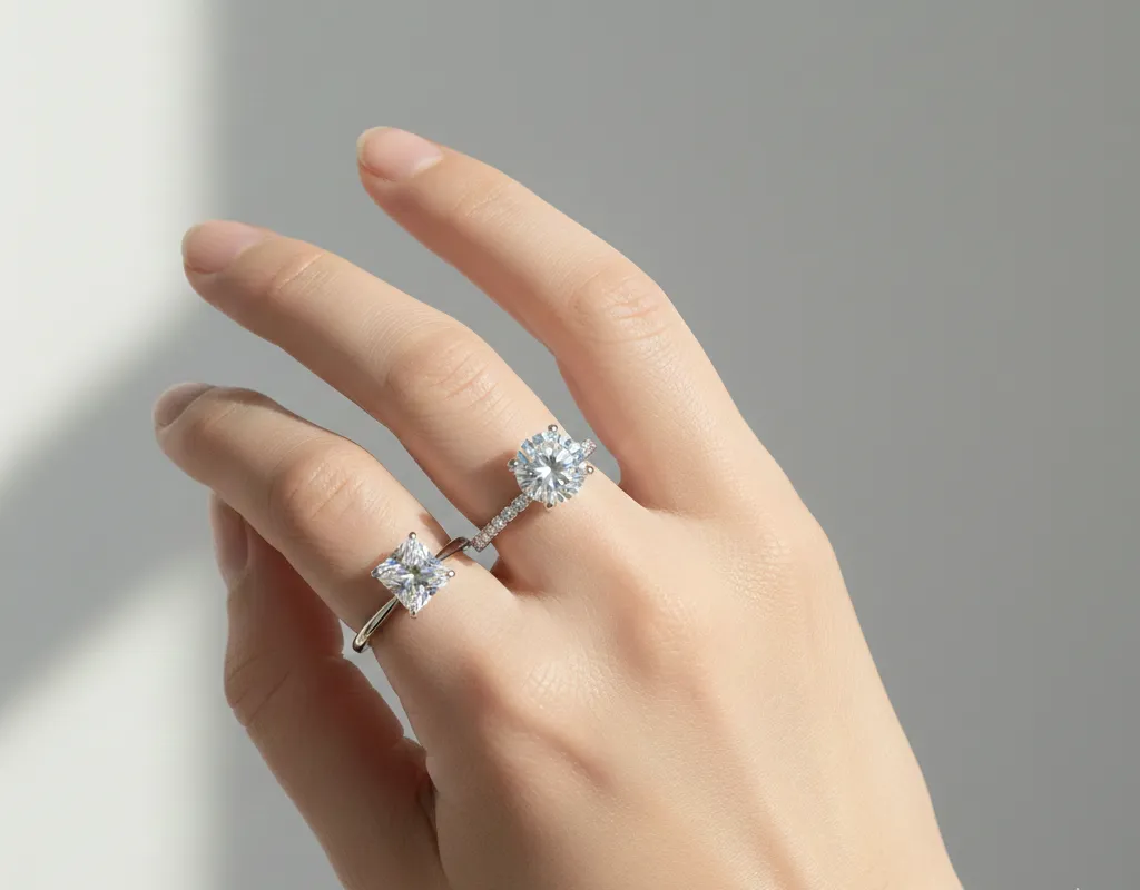 Có nên chọn đá Moissanite làm viên chủ để có kích thước lớn hơn không? Hoàn toàn được nếu bạn ưu tiên sự lộng lẫy và ngân sách. Moissanite có độ cứng 9.25, rất bền cho nhẫn cưới, nhưng hãy chú ý chọn nước màu D để tránh đá bị ngả xanh lục.